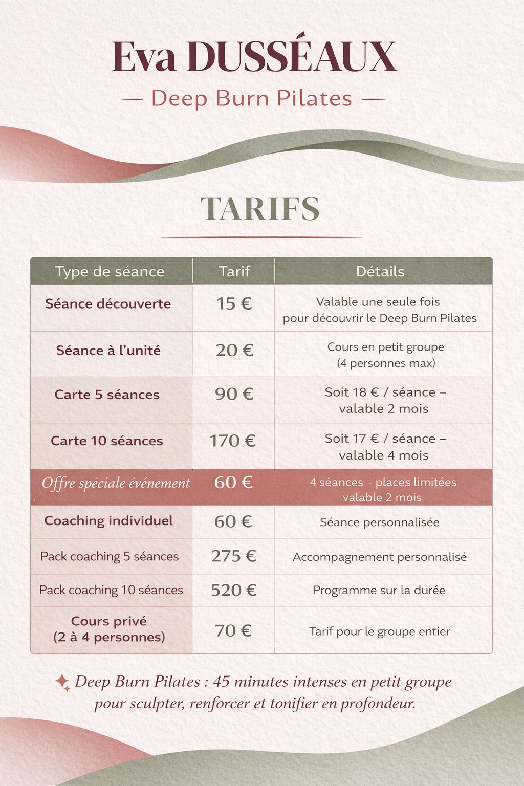 Au cœur des mes accompagnements sportifs, j’utilise une méthode que j’ai conçue à partir du Pilates, une approche reconnue pour améliorer la posture, renforcer les muscles profonds et prévenir les douleurs.